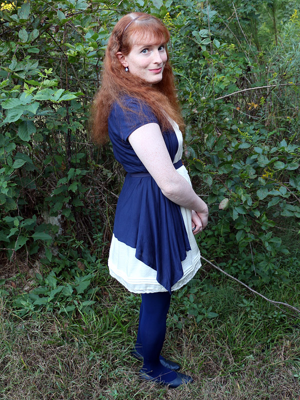 My scarf, made from the severed bottom of the skirt and looped three times around my neck, can be a little fussy. I set it aside for a few months because it kept looking rumpled, but I finally learned how to spread the upper layer of the scarf reasonably smoothly across my chest. But right after this photoshoot, I noticed a little wad of the other layers hanging out the bottom of upper layer. It only took a moment to tuck away, but there it is, in every picture.