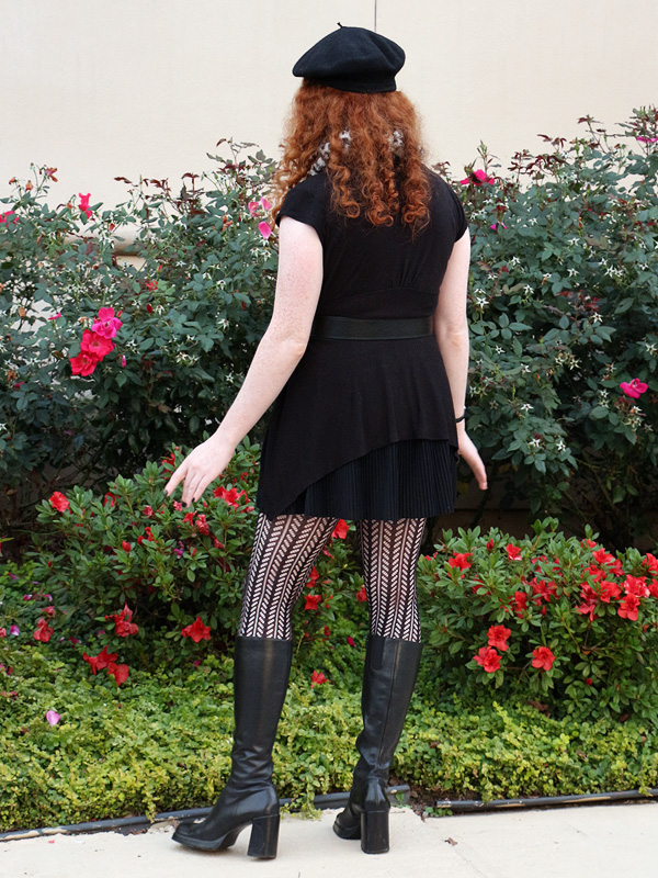 I feel that the neckline of the ruffle front top is a bit lacking, so I wanted to fill it in with a necklace. As you can see from the previous time I wore it on the blog, the necklace has a simple triangular shape. For this occasion, I tucked the edges inside the neckline of my top, then bloused the necklace to make a rounded outline. The effect is not entirely stable, as you can see in the last photo, where the edges have fallen free. But I liked the effect enough that I sewed another piece of black metal mesh into the same folded, rounded shape to make a new necklace.