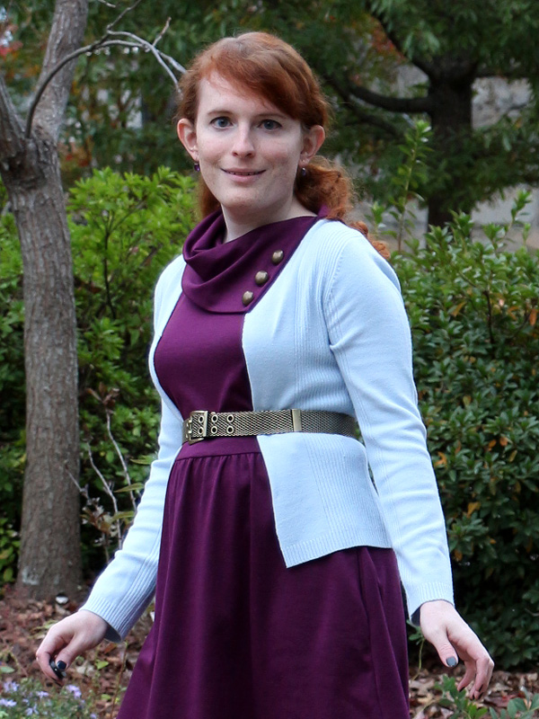 If I find a design I like, I usually buy it in two or three colors. This occasionally leads to entire outfits that differ mainly in color. If you compare this outfit to its immediate predecessor, the dress, cardigan, and earrings are otherwise identical, and the tights are the very same. But the look, I think, is somewhat different.