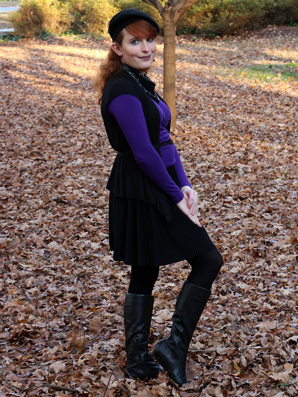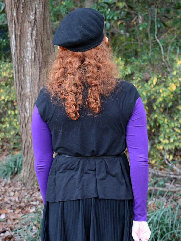 Wearing these two tops together, with a varying bunch of other black clothing, has been one of the most important style combinations in my wardrobe in recent years, though the purple top is nearly worn out at this point. Several of the items from this post were previously worn together in one of my earliest posts. (Looking back, I feel a strong need to apologize for the shortcomings of my old camera!)