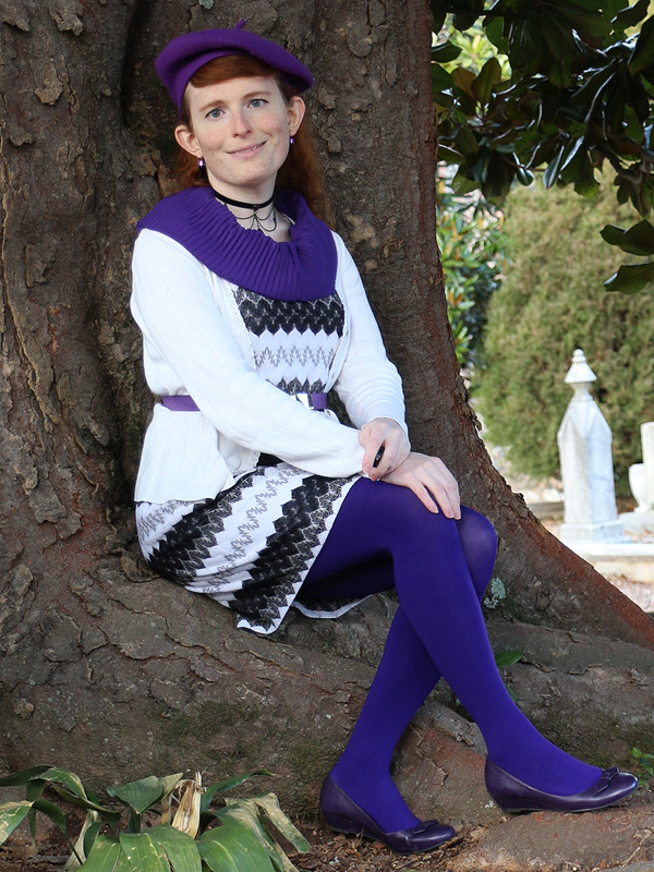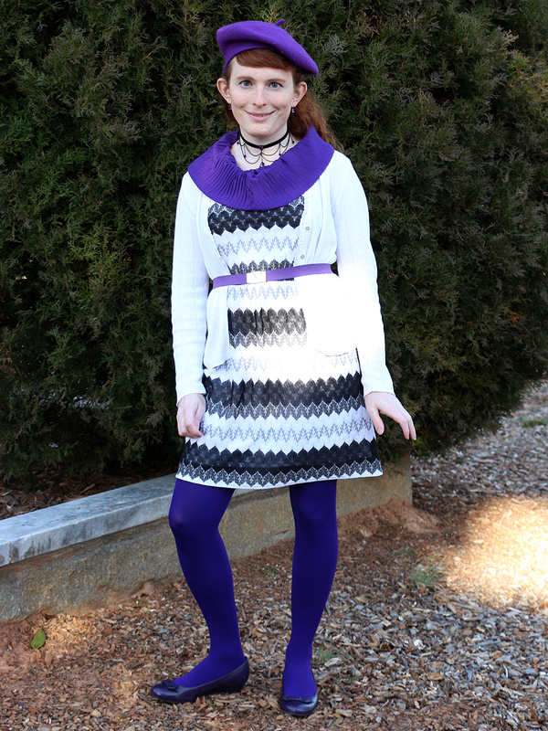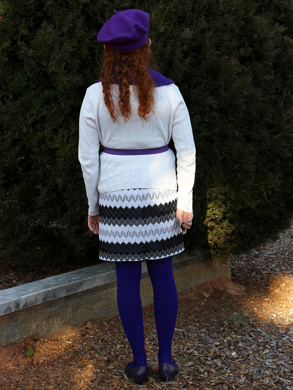I've worn this scarf, belt, and pair of earrings on the blog a number of times before and even the beret and necklace once each. And now I've added these purple tights and wedges to my wardrobe as well. Be prepared for a lot more purple outfits to come. (Though, as of writing, I've finally picked up a few great green items too!)