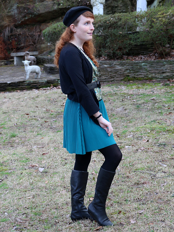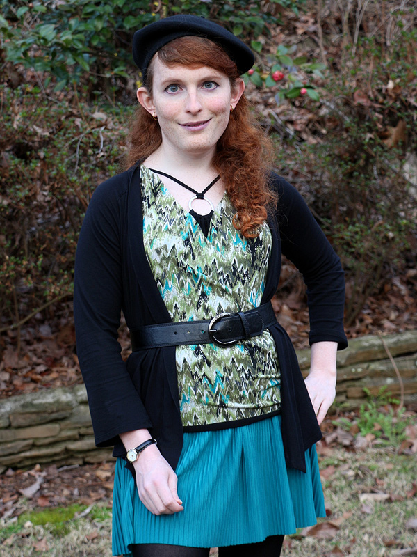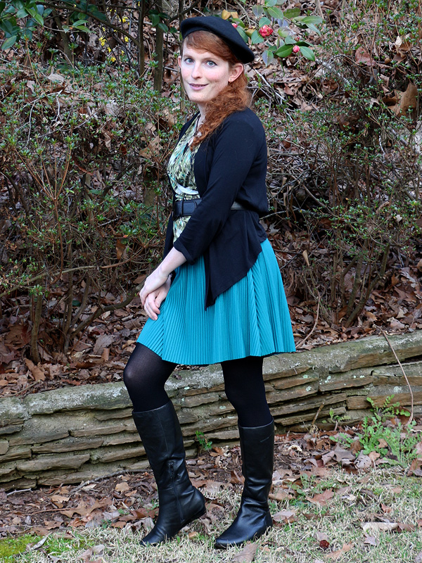 I've worn this top quite a bit over the years and I'm still fond of the hydrid mock wrap/halter design. I'm actually a bit surprised it hasn't appeared on the blog before, but I can figure out why. I've tried to sharply limit the number of posts that consist of a colored top and a bunch of black pieces, which is how I've always worn it before. Once I noticed that the teal accents of the top match my teal accordion skirt, this outfit became inevitable.