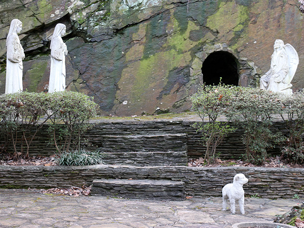 So after more than half an hour of wandering around and shooting in this little outdoor chapel area that was neatly sheltered from the sun despite the earliness of the hour, I decided to do one more photoset up on a dias. I hadn't really thought much about it the whole time, but as I approached, I was beset by sudden dread. I couldn't immediately place the source, so I cautiously kept walking, but the horror kept mounting. Then it hit me. I paused, hesitated, and began a reluctant retreat. Here's the dias: