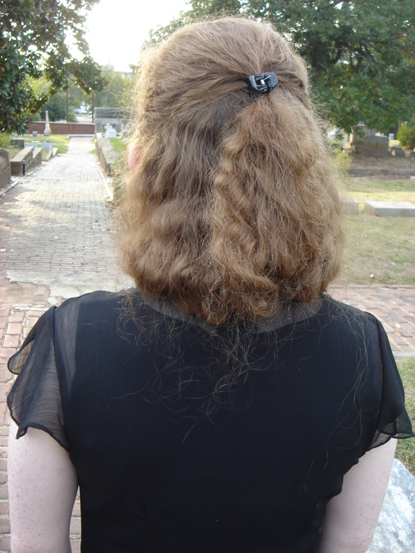 My hair is nearly waist length, but I sometimes tuck it under to simulate a bob. I should probably only try that when wearing lighter colored clothing that doesn't highlight the few hairs which escape the clips. But I'll probably end up only tucking my hair when wearing black or navy.