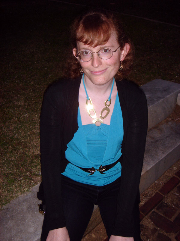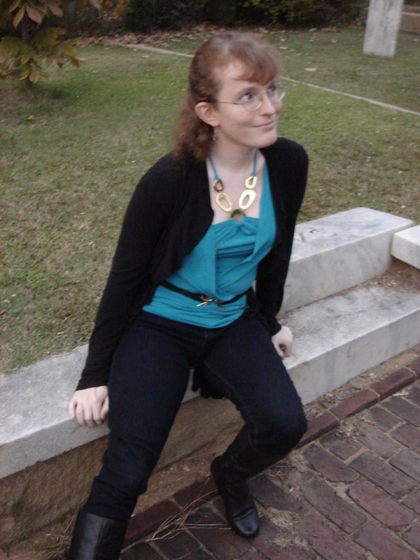 My top is of a curiously complex design I'm rather fond of, where a mock wrap has a center section supported by a halter. The blue cord originally tied in the back, but it was difficult to adjust to a desired length and the knot always managed to capture some of my hair. I added a lobster clasp and a two inch chain for easy adjustment. Normally I wear the chain so that the neckline is nearly as high as it will go, but knowing the manner in which many of my fellow con goers would be dressing, I let it all the way down today.
