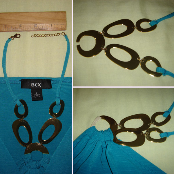 When I first washed this top, the gold loops rattled loudly in the washing machine and in the dryer, disturbing the whole house. Examining it afterward, the gold was covered with tiny dings and scratches, mainly at the joints. I decided I needed to alter the metal components to make them removable for washing, which I did by cutting a narrow section out of the bottom loop. To keep the loop in place the rest of the time, I wrap a bit of masking tape around the gap.