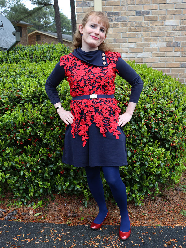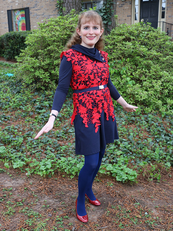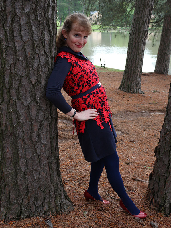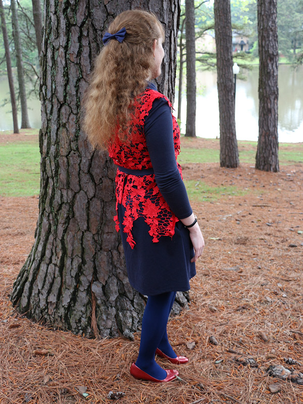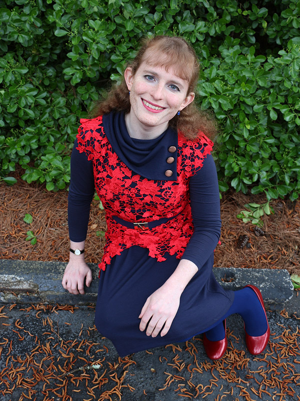 My purchase of this top was heavily influenced by Kristina Bazan's use of a similar top here. I'm not sure which of the two I prefer. Peplum tops, like hers, are generally unflattering on me, but the dangly bits on mine present their own pains. Both are orangey reds, while I prefer more burgundy shades. And mine is really hard to button up the back.
