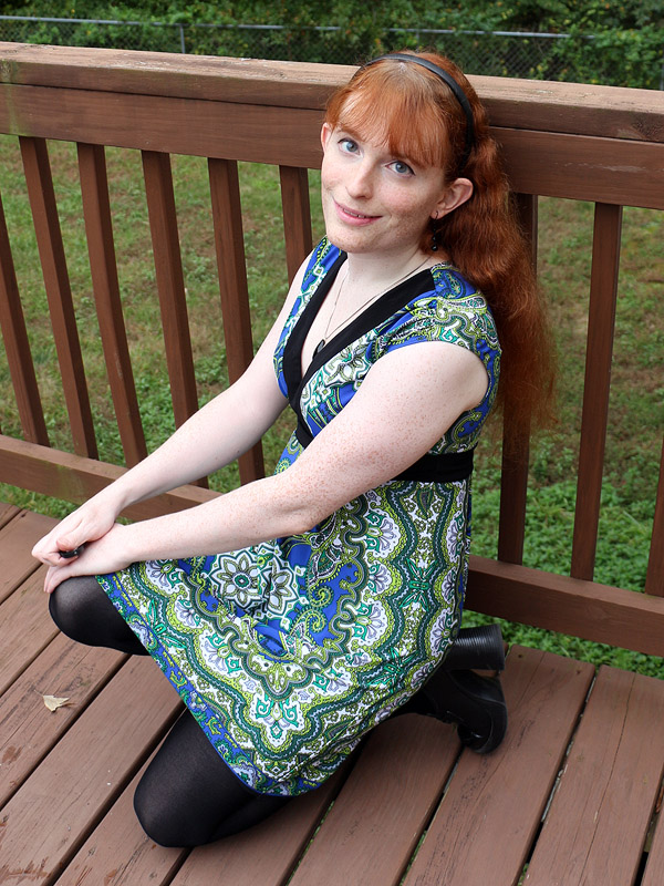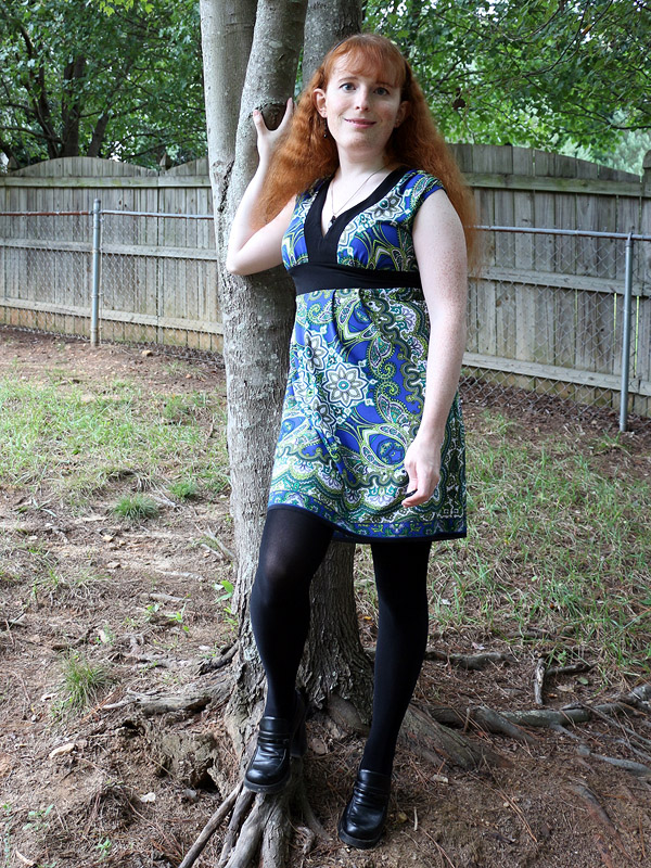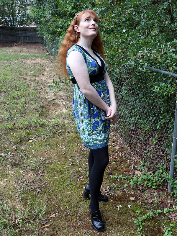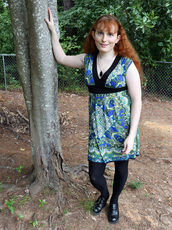This was the first of my black banded Macy's dresses. I bought it even though I wasn't wearing dresses very often at the time, as I was quite taken with the pattern. I wore it not long after that, struggling to tie a neat bow in the back. Then I ended up riding in a car for a couple of hours, with the knot pressing painfully into my spine the entire time. I set the dress aside as a bad idea and only revisited it recently, when I was evaluating clothes to keep or give away. I altered it the same way I did this one, allowing me to start wearing it again.